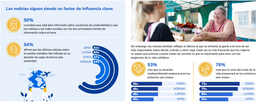 • Las noticias y las redes sociales son fuentes clave de información sobre sostenibilidad para los viajeros. Un 54% de los encuestados indicó que las noticias sobre el cambio climático influyen en sus decisiones de viaje, reflejando la importancia de la información accesible y confiable.