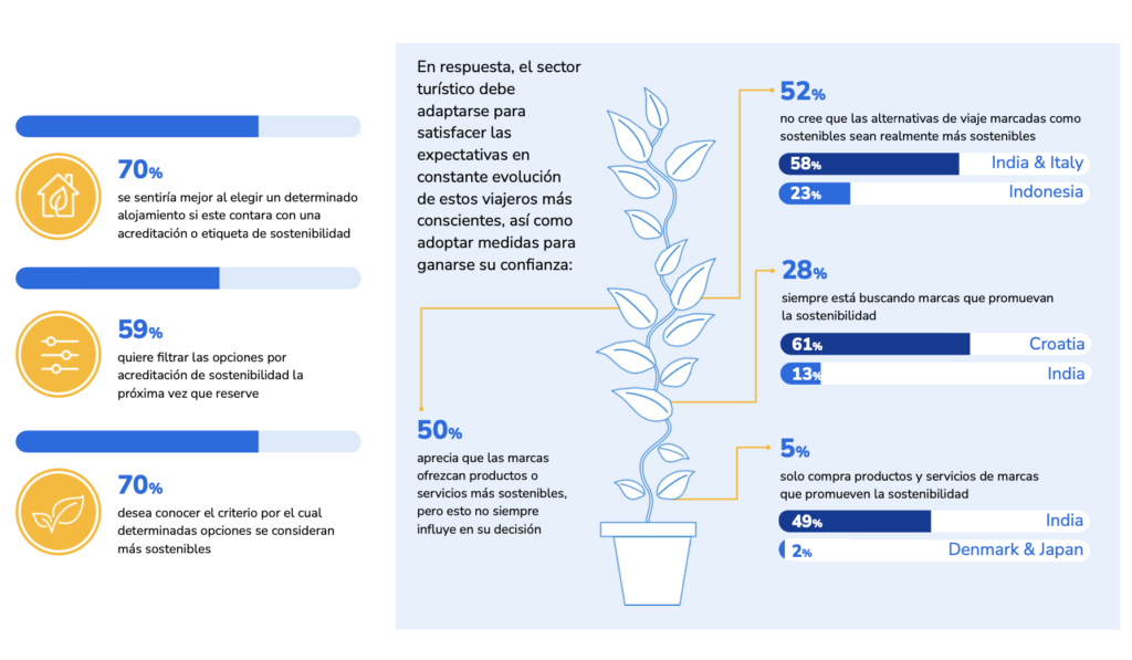 • Los viajeros están cada vez más conscientes de la urgencia de actuar para preservar el planeta. Aunque algunos consideran que las opciones sostenibles son costosas, muchos están adoptando hábitos sostenibles como reutilizar toallas y apagar el aire acondicionado en sus alojamientos. Esto refleja un cambio de la intención a la acción en términos de sostenibilidad.